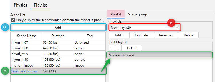 | (4) | ![]() | Switch to the [Playlist] tab and select the desired playlist (A) from the [Playlist List]. Select the scene group you want to add from the [Scene list] (B) and click [Add]. (C) |