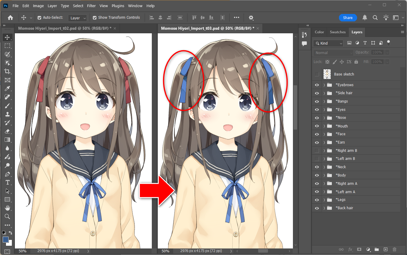 A cowlick that was not in the re-imported “mark_free_import_t03.psd” will appear tied to the original “mark_free_import_t02.psd.”