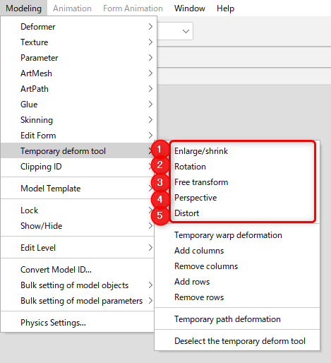 Alternatively, click [Form Animation] menu -> (1) to (5) of [Temporary deform tool].