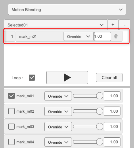 Since multiple motions can be selected/played back, actual combinations can be checked, such as motion for the body, motion for a specific part of the body, and motion for facial expressions.