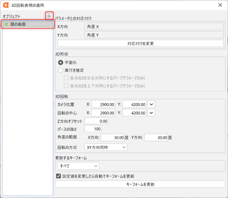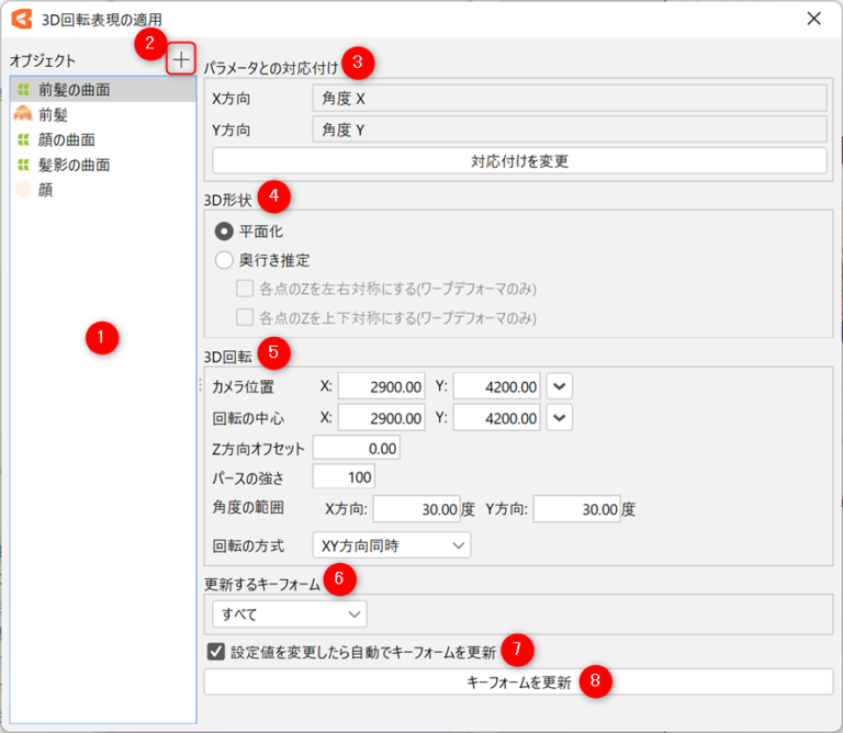 | 7 | 설정값을 변경하면 자동으로 키 폼 업데이트 | 체크할 경우 [파라미터와의 매칭] [3D 형상] [3D 회전] [업데이트할 키 폼]의 설정을 변경하면 수시로 자동으로 키 폼을 갱신합니다. |