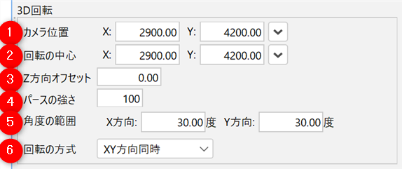 [3D 회전]의 각 항목을 설정합니다. 각 항목에 대한 자세한 내용은 위의 화면 설명을 참조하십시오.