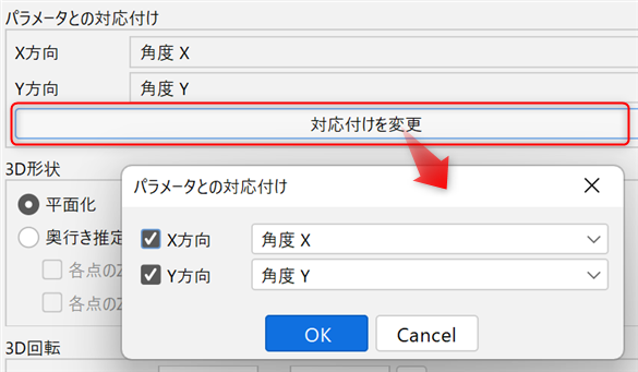 [파라미터와의 매칭]에서 X방향, Y방향으로 회전시키기 위한 파라미터를 지정합니다.