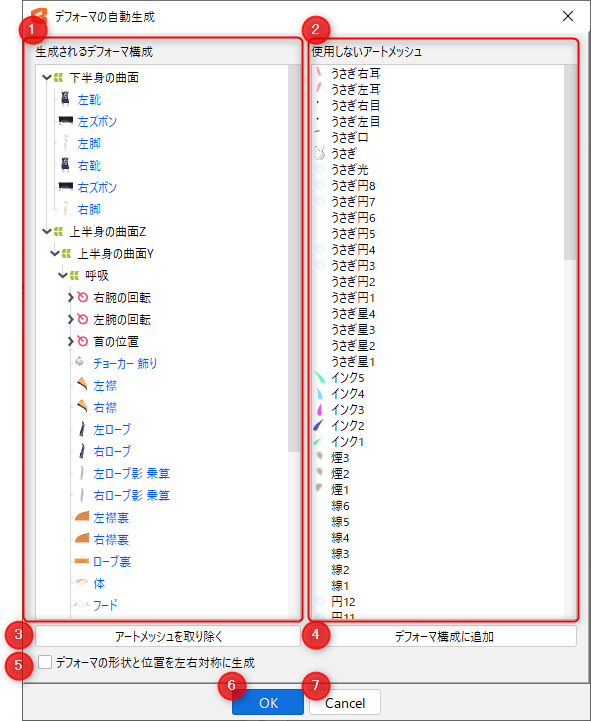 | ⑥ | OK | 디포머 생성을 실행합니다. 디포머가 생성되어 [디포머] 팔레트의 루트 바로 아래에 대화 상자와 동일한 구성으로 배치되고 아트메쉬도 대화 상자와 동일하게 배치됩니다. 기존 디포머 구성은 그대로 유지됩니다. |