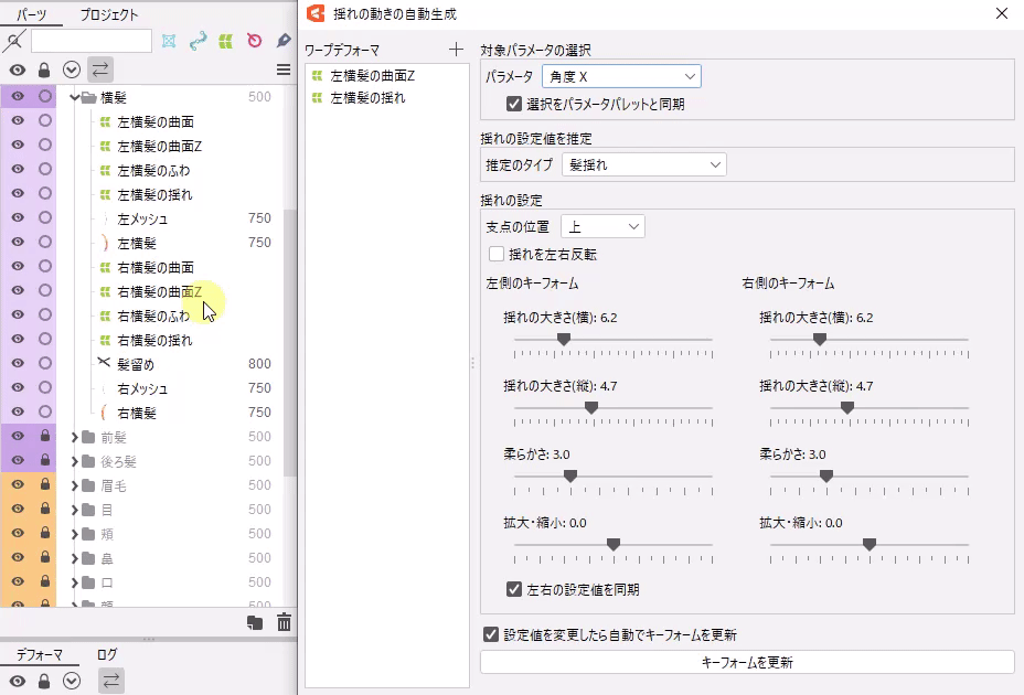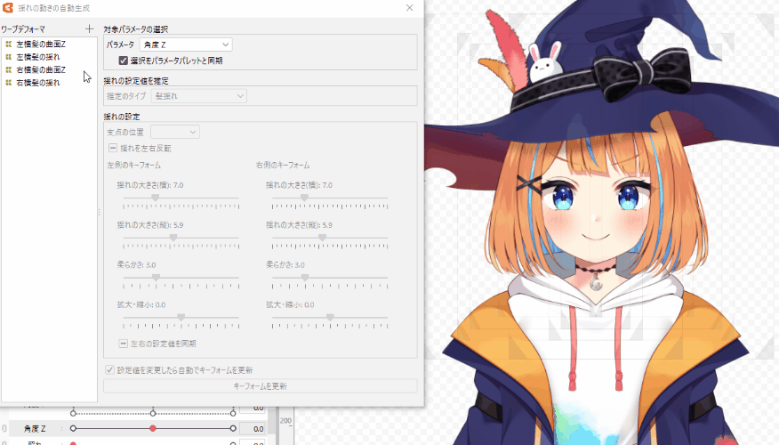 | ⑨ | 좌우 설정값 동기화 | 체크되어 있으면 [흔들림 변형 조정]의 좌측 키 폼과 우측 키 폼의 설정값이 동기화됩니다. 디폴트로 체크되어 있으므로 좌우 비대칭인 흔들림 변형을 만들고 싶은 경우 체크를 해제해 주세요. |