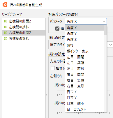 | ⑤ | 추정 타입 | 디포머에 맞는 적절한 흔들림 설정값을 추정하고 흔들림 설정을 변경합니다. [머리카락 흔들림]과 [각도 Z에 의한 처짐 생성]의 2종류의 추정을 선택할 수 있습니다. |