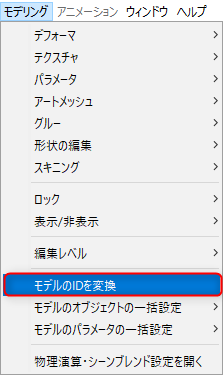 Cubism2.1에서 만든 모델 데이터를 열고 [모델링] 메뉴 → [모델 ID 변환]을 클릭하여 [변환 설정 대화 상자]를 표시합니다.