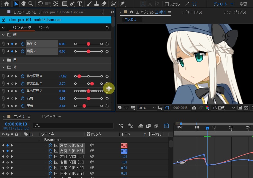 게다가 AE상에서 직접 모델의 모션 편집을 할 수 있기 때문에 Cubism Editor에서 출력한 동영상이나 일련번호 스틸 이미지를 사용할 필요는 없습니다.