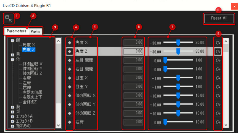| ③ | 파라미터 확장 트리 | 파라미터가 트리로 표시되고 확장할 수 있습니다. cdi3.json을 로드하면 애니메이션 뷰에서의 이름을 재현합니다. |