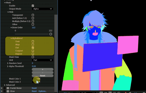 | Alpha Blend | Cubism 5.3의 각 알파 블렌드가 설정된 ArtMesh ・Over ・Atop ・Out ・Conjoint ・Disjoint |