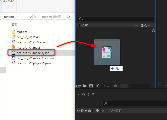 조금 전에 내보낸 [.model3.json] 파일을 프로젝트 패널로 직접 드래그 앤 드롭합니다.