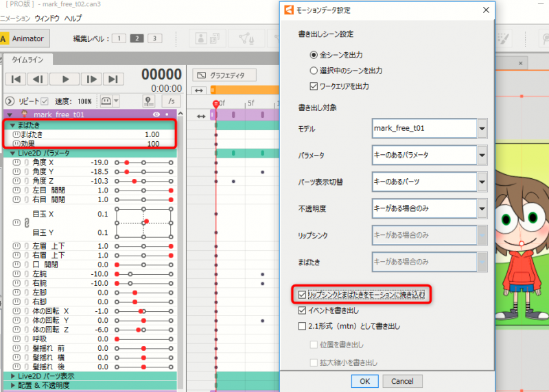 모션 데이터를 내보낼 때 [립싱크와 눈 깜빡임을 모션에 베이크]에 체크를 합시다.