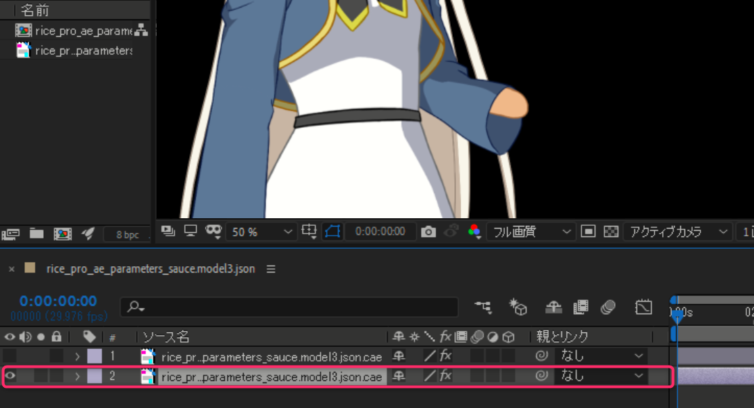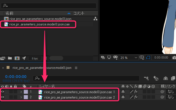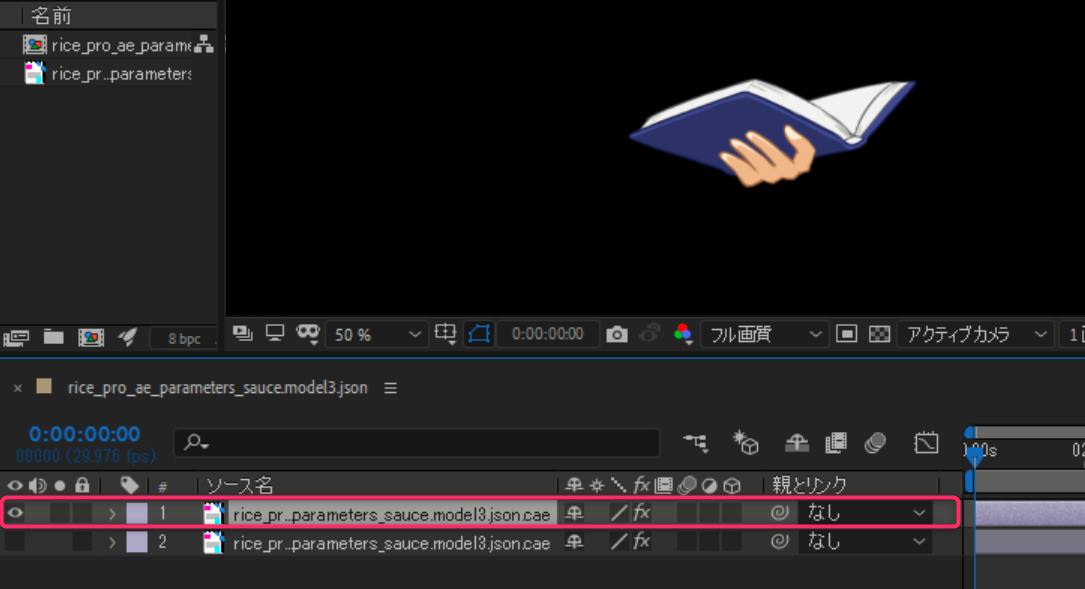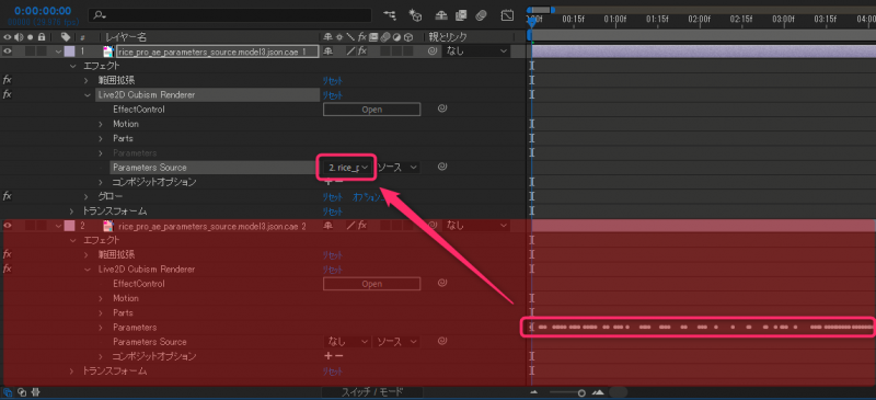 참조 레이어를 지정함으로써 [rice_pro_ae_parameters_source.model3.json.cae 2]의 파라미터 동작에 맞춘 모션이 됩니다.