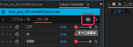 Cubism 컨트롤러의 파츠 비표시 버튼을 클릭하면 모든 파츠가 숨겨집니다. (빨간 테두리 안 눈알 아이콘)