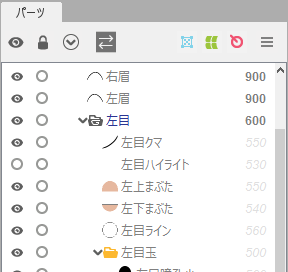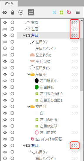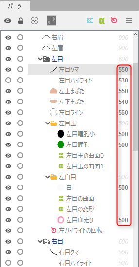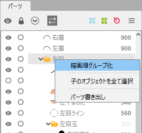 파츠의 그리기 순서는 기본적으로 「500」의 설정값을 가지는데, 그룹으로 하면 그 설정값이 유효해집니다.