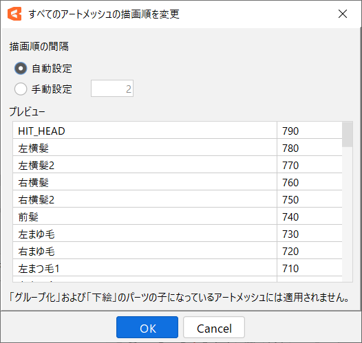 [모든 아트메쉬의 그리기 순서 변경], [아트메쉬 그리기 순서 일괄 변경] 대화 상자의 정렬 순서는 파츠 팔레트의 정렬 순서와 동일합니다.