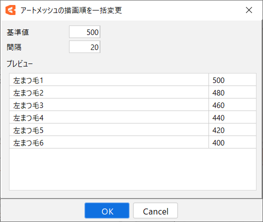 [모델링] 메뉴 → [아트메쉬] → [아트메쉬 그리기 순서 일괄 변경]에서 설정 대화 상자를 엽니다.