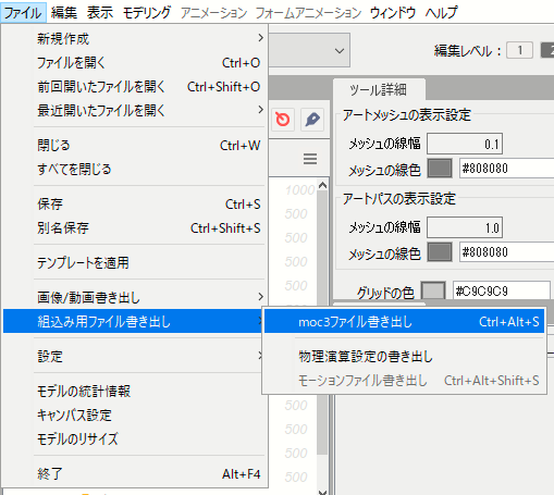 [파일] 메뉴 → [임베디드용 파일 내보내기] → [MOC3 파일 내보내기]