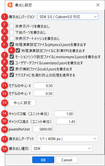 | ⑱ | 내보내기 유형 | SDK용 또는 nizima용으로 내보낼지 선택합니다. nizima를 선택하면 모델 이름과 미리보기 크기를 설정할 수 있습니다. |
