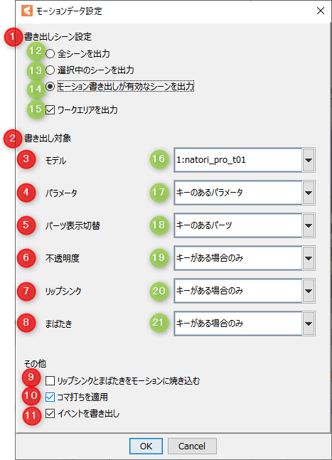 | ⑨ | 립싱크와 눈 깜빡임을 모션에 베이크 | 립싱크와 눈 깜빡임의 이펙트 설정을 모션의 키 프레임에 베이크합니다. |