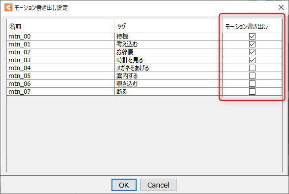 모션 내보내기 설정에서 임의로 모션을 선택하고 내보낼 수 있습니다.