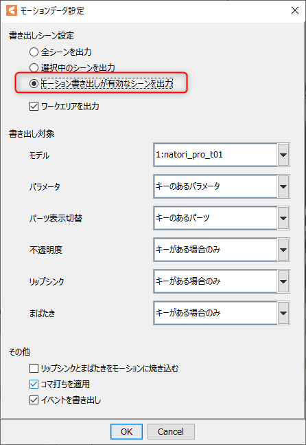 내보낼 장면 설정의 [모션 내보내기가 유효한 장면 출력]을 선택하고 [OK]를 클릭합니다.