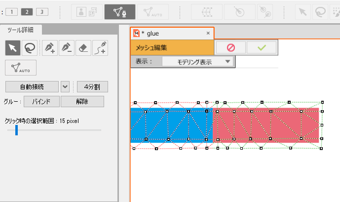 글루로 흡착시키고 싶은 부분의 정점을 「2개의 겹쳐진 정점」에 다시 찍습니다. 흡착시키고 싶은 부분의 정점을 지우개나 올가미 툴를 사용해 지워 주세요. |