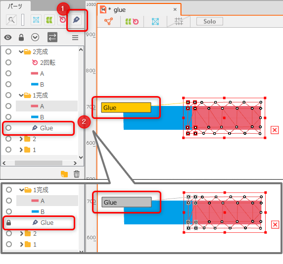 글루가 설정되면 1. 뷰 영역에 노란색 「Glue」 태그(②)가 표시됩니다. [파츠] 팔레트의 글루에 잠금을 적용하면 태그가 회색으로 바뀌고 글루를 편집할 수 없게 됩니다. TIPS[파츠] 팔레트의 우측 상단에 있는 글루의 필터 추가 버튼(①)으로 팔레트 내 글루 오브젝트의 표시/비표시가 가능합니다. |