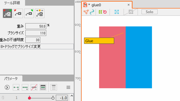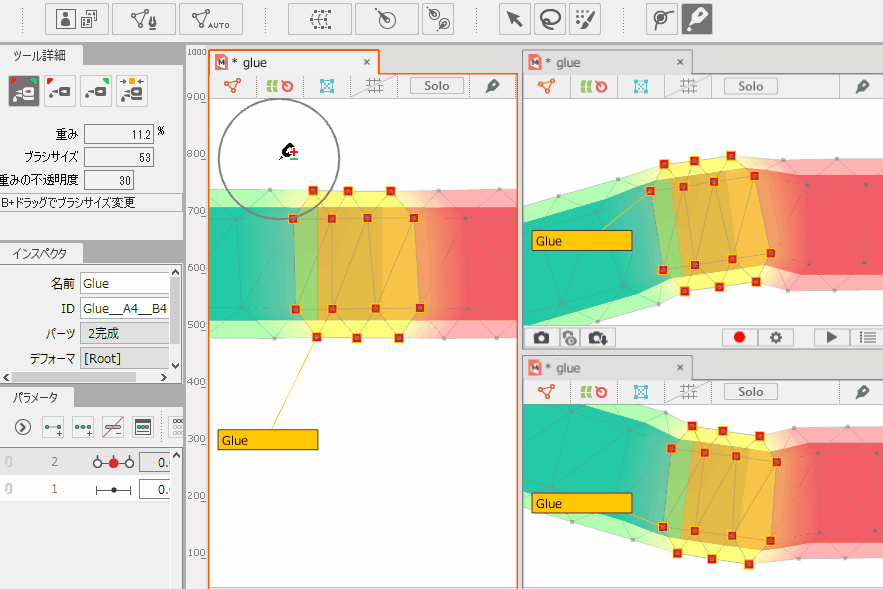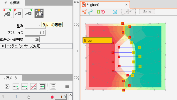 글루를 설정한 아트메쉬에 표시된 노란색 「Glue」 태그를 클릭하거나 [파츠] 팔레트에서 해당 글루의 오브젝트를 클릭하여 가중치 조정 모드로 전환합니다. 단일 정점 무게(가중치) 비율을 조정하려면 [툴 상세] 팔레트 → [글루의 무게 A] 또는 [글루의 무게 B]를 사용합니다. |