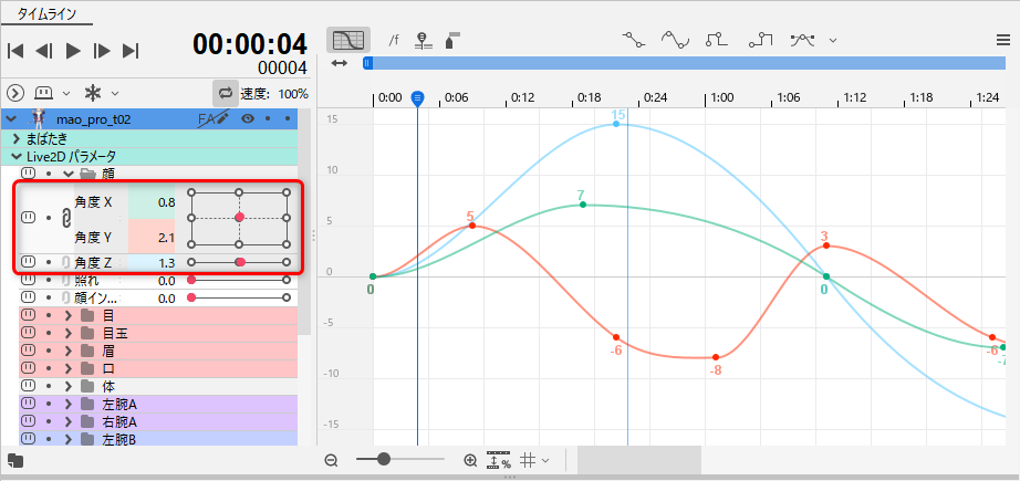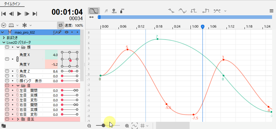 Cubism Editor에는 보간하는 곡선의 종류가 5종류가 있어 다양한 애니메이션을 만들 수 있습니다.