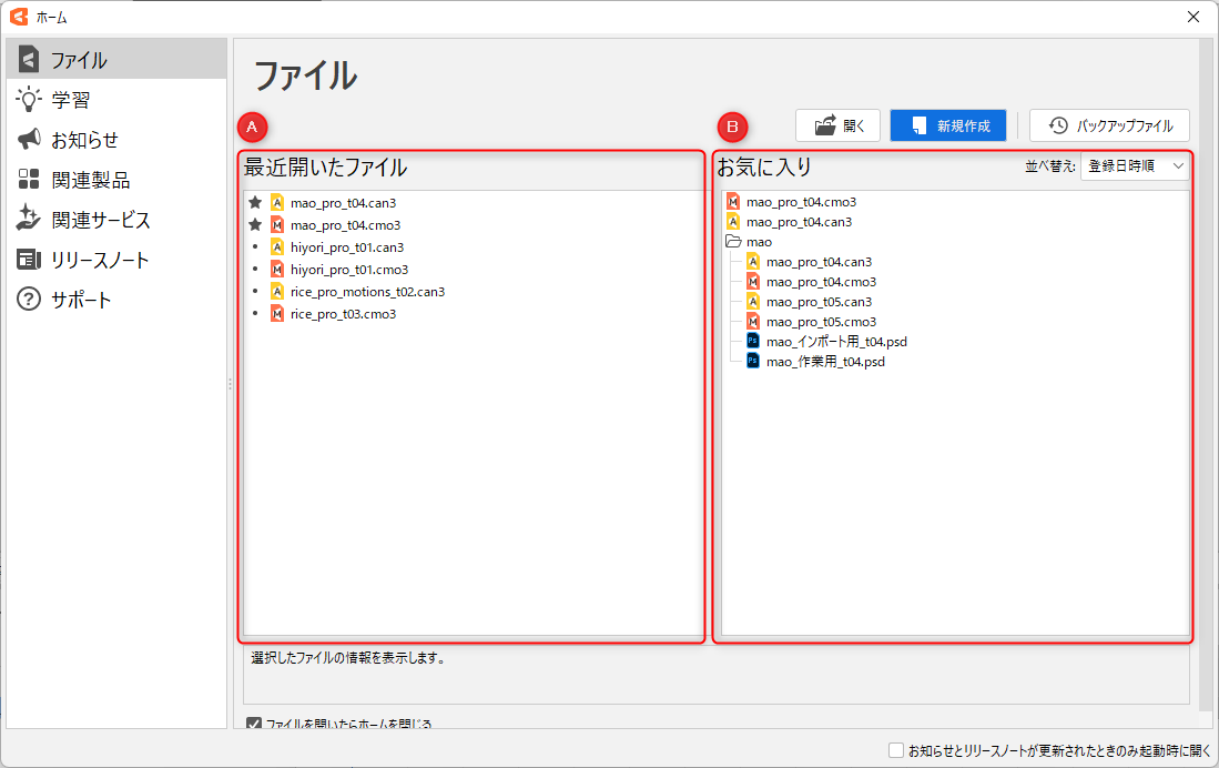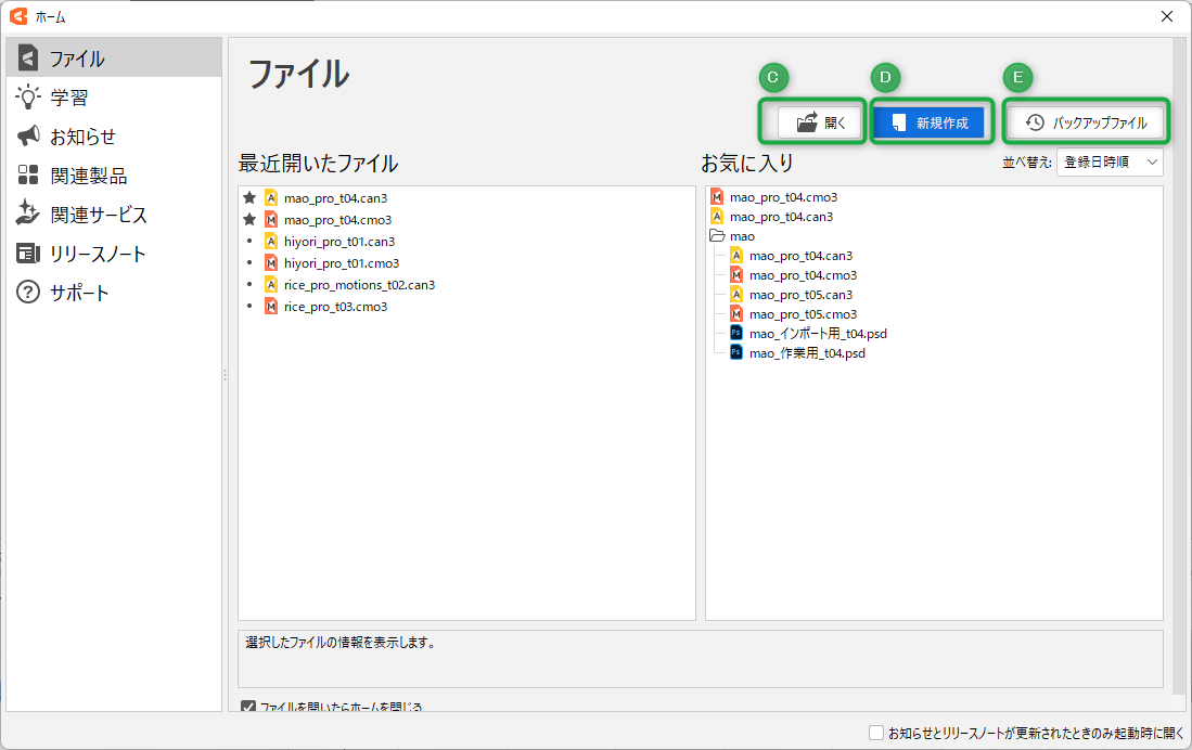 | PSD 파일에서 생성 | PSD 파일에서 모델 파일을 새로 만듭니다. 테두리 내에 파일을 드롭하거나 [파일 선택] 버튼으로 만들 수 있습니다. 새로 만든 후의 흐름은 「PSD 가져오기」를 참조하십시오. |