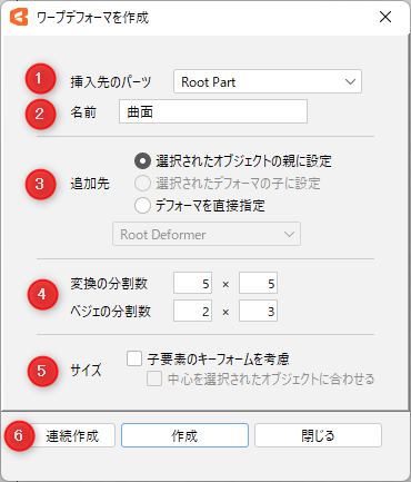 | 6 | 연속 생성 | 대화 상자를 닫지 않고 연속으로 워프디포머를 생성합니다. | |