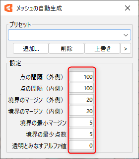 | 경계의 최소 마진 | 모서리 부분 등에서 불투명 화소와 메쉬가 가까워지는 경우에 위에서 지정한 [경계 마진]을 확보할 수 있도록 점을 추가합니다. ※1 (GIF는 값이 큰 경우와 작은 경우의 비교) ![]() |