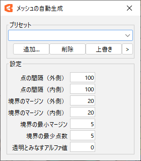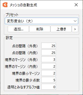 메쉬 편집에는 점 밀도에 관한 값을 지정하기만 하면 자동으로 생성할 수 있는 「자동 생성」과 점을 하나씩 찍고 편집할 수 있는 「수동 편집」이 있습니다.