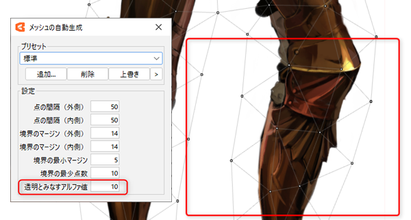 이러한 경우는 「투명으로 간주하는 알파값」을 0부터 서서히 크게 해 메쉬의 분할을 조금씩 조정합니다.