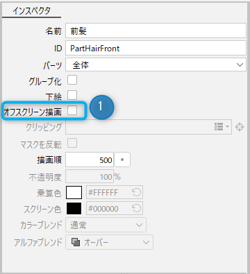 - 인스펙터 팔레트의 [오프스크린 렌더링](①)에 체크합니다.