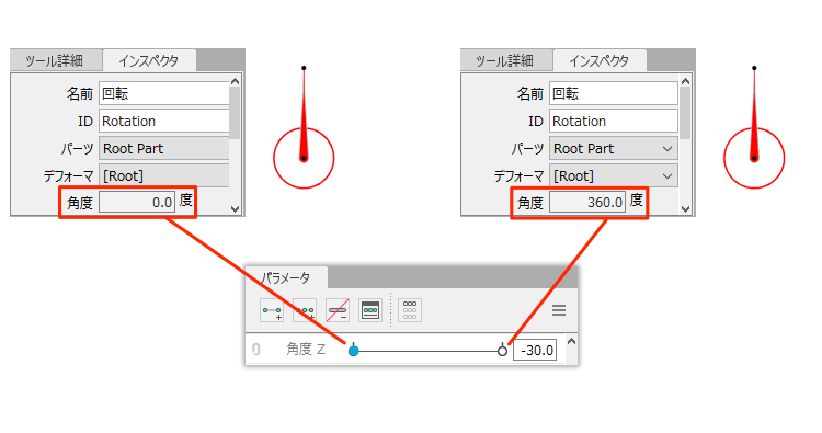 역1회전시키는 경우 최초의 각도에 -360도를 더한 수치로 설정합니다.
