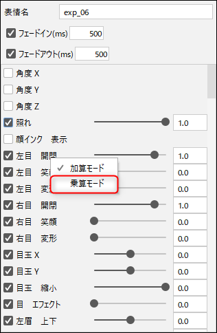 눈 개폐의 파라미터값을 「곱하기 모드」로 설정하면 자연스럽게 깜박이게 됩니다.