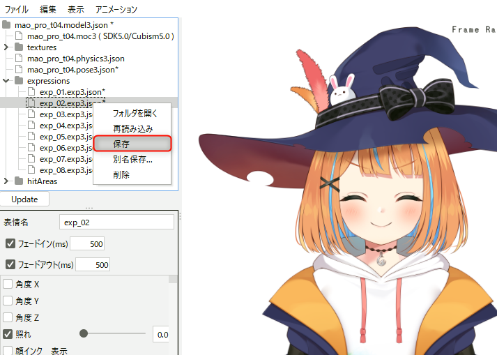 애니메이션 뷰로 내보낸 표정용 motion3.json을 Cubism Viewer에 로드하여 exp3.json 파일을 만듭니다.