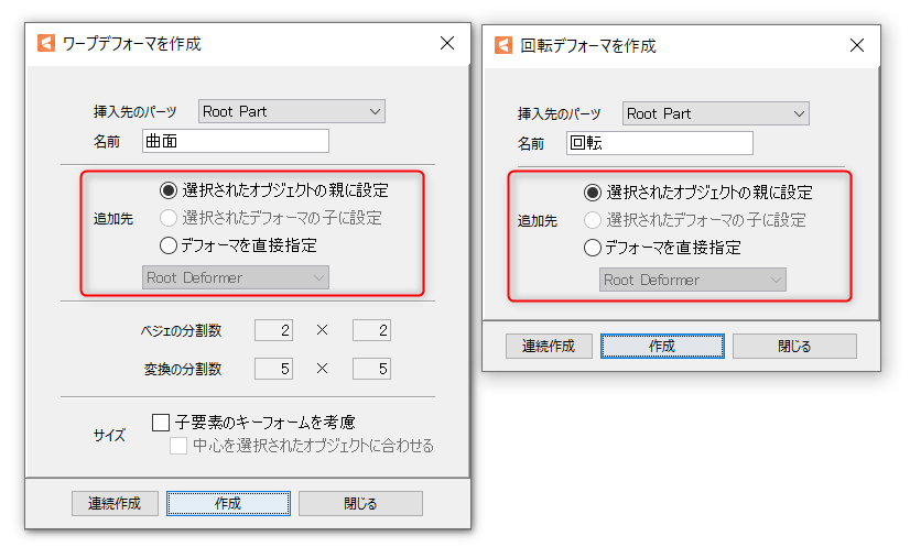 4. [생성]을 클릭하면 [추가 대상]에서 선택한 설정에 따라 새 디포머가 만들어집니다.