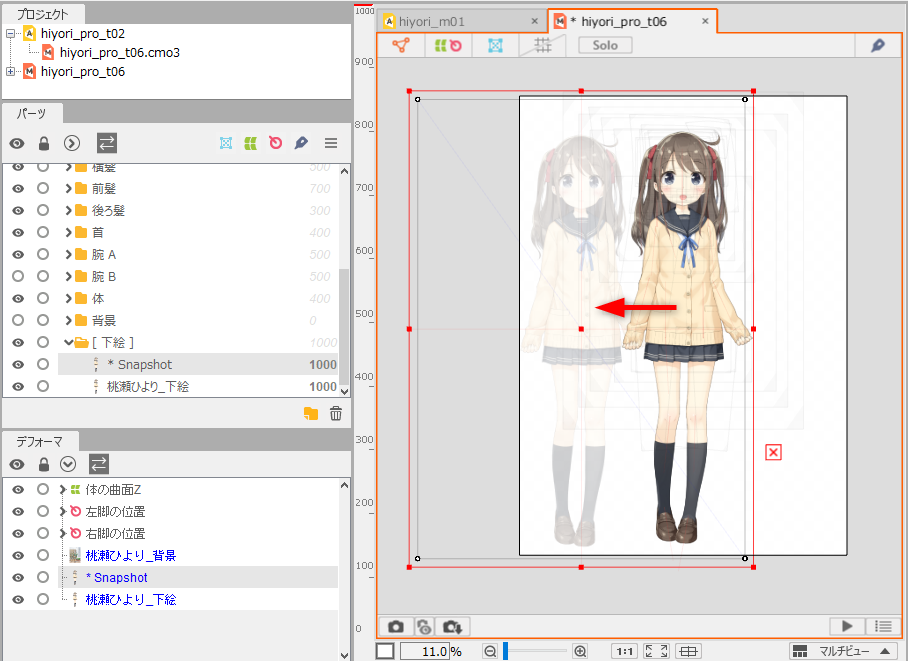 스냅샷 기능을 사용하여 밑그림화한 아트메쉬는 불투명도 25%의 상태로 「밑그림 파츠」에 배치됩니다.