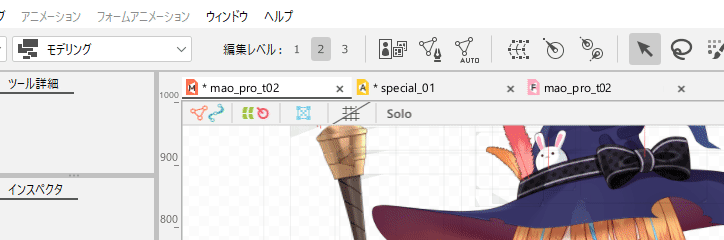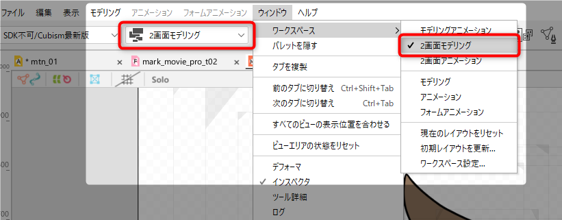 에디터에서는 모델과 애니메이션을 만들 때 워크 스페이스를 전환하면서 작업을 수행합니다.