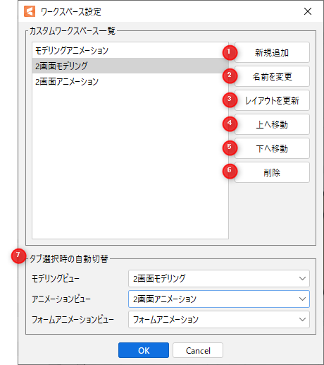 | ⑤ | 아래로 이동 | 목록에서 선택한 커스텀 워크 스페이스의 정렬 순서를 하나 아래로 이동합니다. 정렬 순서는 다음에도 반영됩니다. ・커스텀 워크 스페이스의 콤보 박스(툴바) ・윈도우 메뉴 |