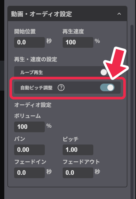 - レイヤーを選択した状態で、右側のパレット内に表示される「動画・オーディオ設定」の自動ピッチ調整をオンにします。