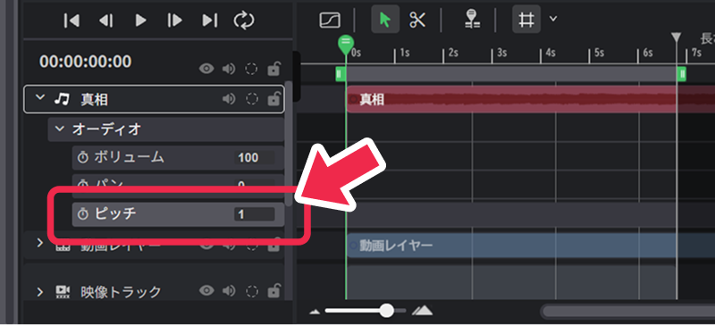 - レイヤーを選択した状態で、右側のパレット内に表示される「動画・オーディオ設定」の「ピッチ」項目から設定できます。
