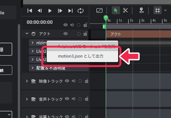 「nizima LIVE モーション」を右クリックし、「motion3.jsonとして出力」を選択し、書き出してください。