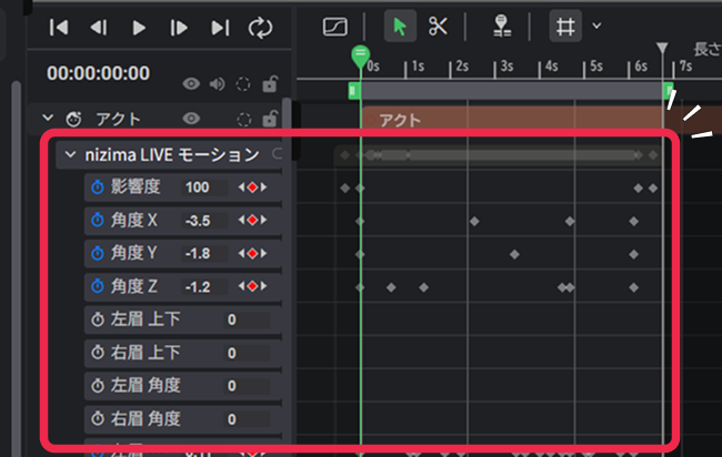 録画した動きは、この「nizima LIVE モーション」に対して、あらかじめキーフレームが打たれた状態でタイムラインに反映されます。