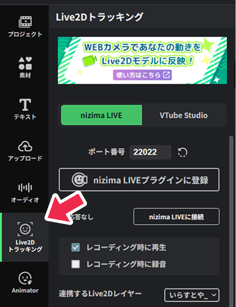 nizima ACTION!!に戻り、サイドバーの「Live2Dトラッキング」パネルを開きます。