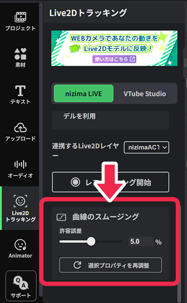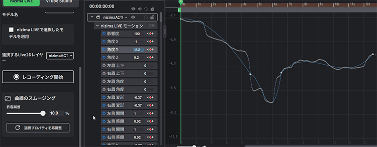 録画後、Live2Dトラッキングのパレット内にある「曲線のスムージング」からキーフレームの数を調整し、カーブの滑らかさを調整することができます。