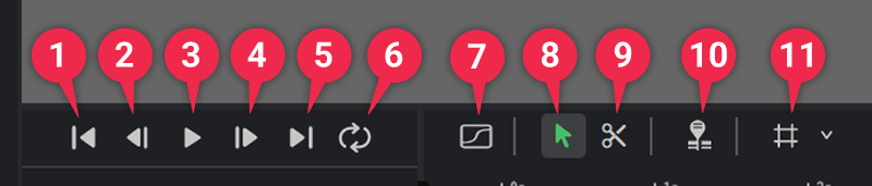 ➎ | 終了フレームへ移動 | 再生ヘッドをワークエリアの終了位置へ移動します。 |